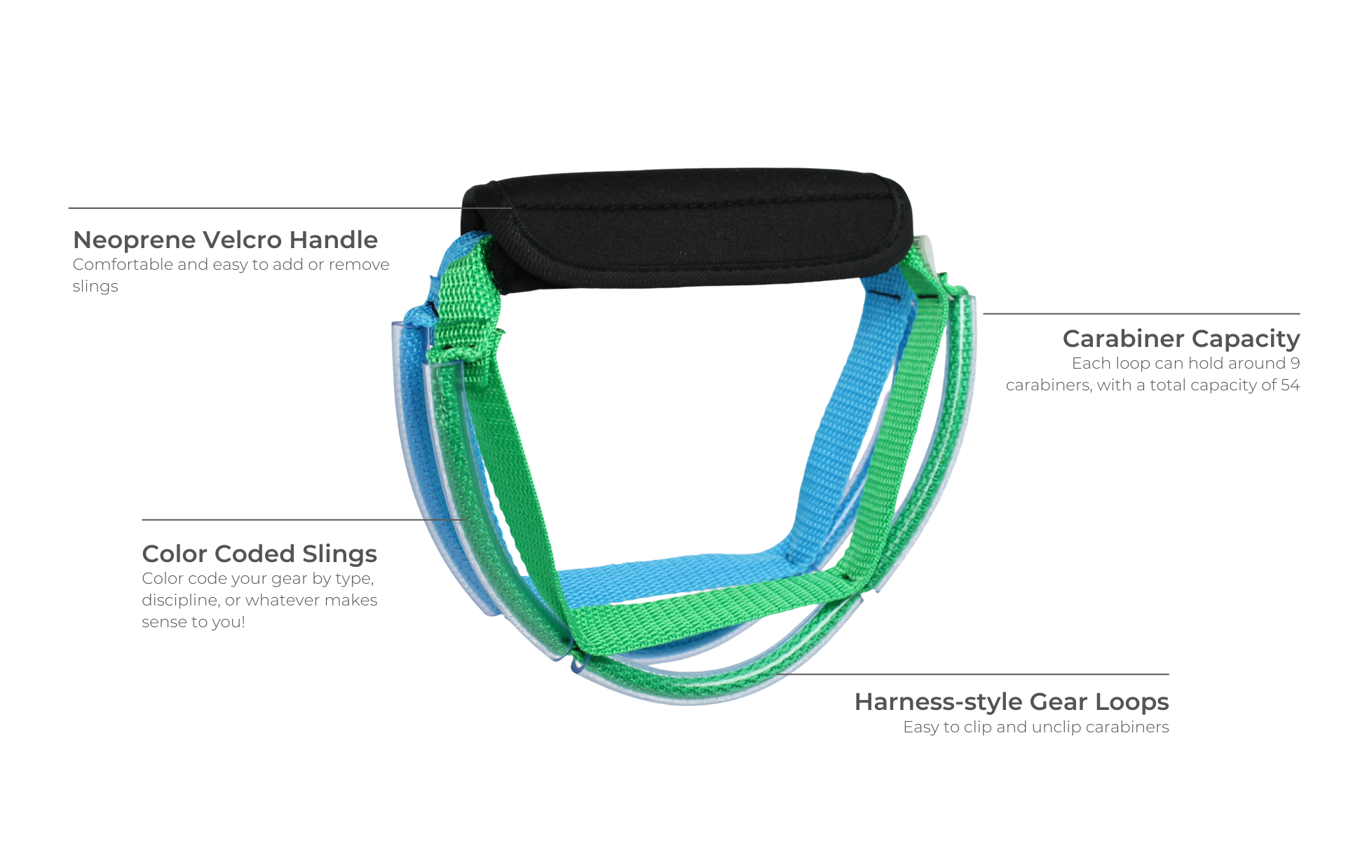 The Rock Climbing Gear Organizer is the simple solution for keeping your carabiners, quickdraws, shoes, chalk bags, and more all in one place and ready to go climbing. Hang the slings at home and bring them with you to the cliffs. These slings make picking up and moving between climbs quick and easy. Spend less time re-racking gear and more time climbing!